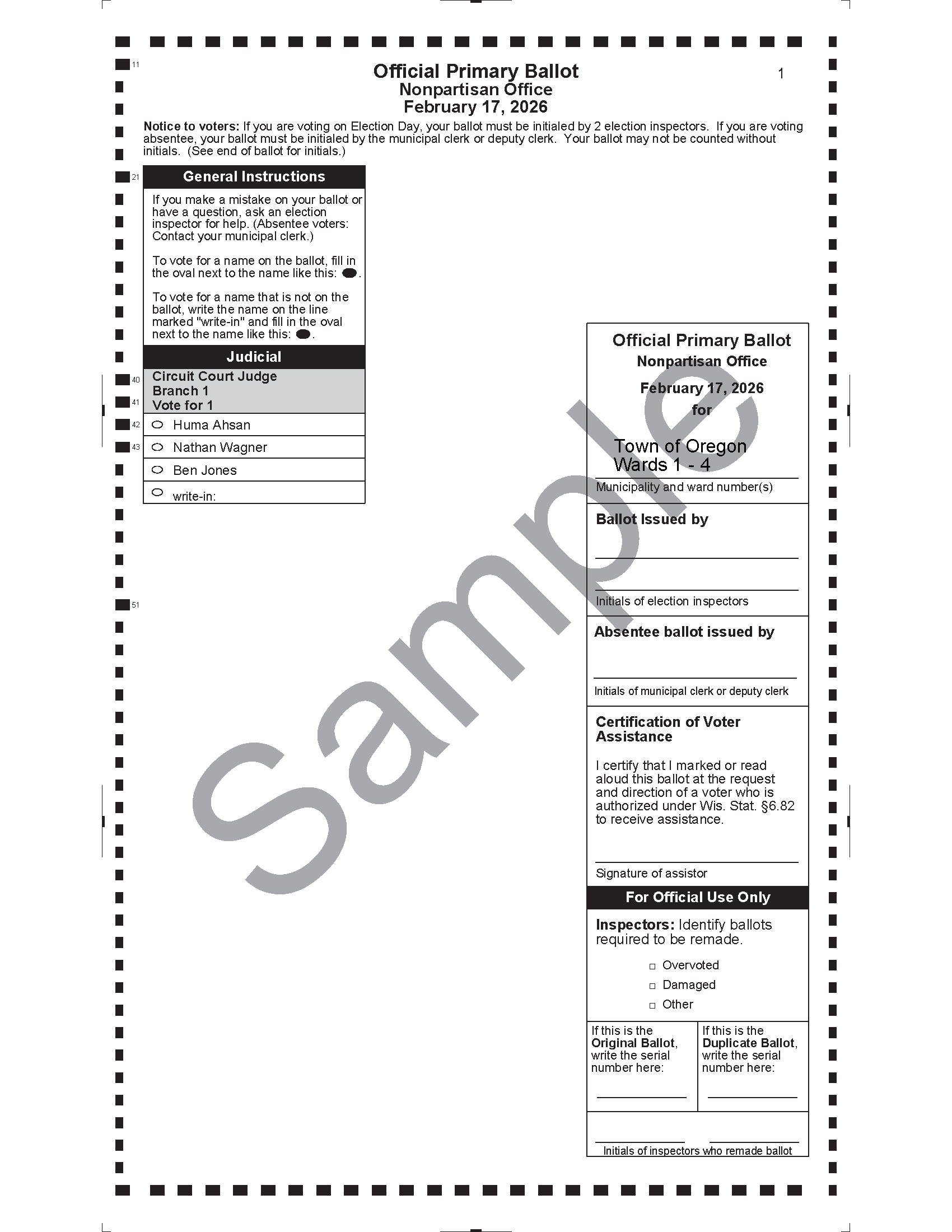 The Town of Oregon will hold an Election on Tuesday, February 17 for Spring Primary from 7am to 8pm. There is only one office on the ballot for Judicial Circuit Court Judge Branch 1. Additional voting information can be found here https://townoforegonwi.gov/election-information/